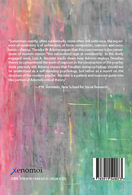 Zwangsanalyse. An Essay on Adorno and the Compulsion of the Dialectic is a philosophical account of German philosopher Theodor W. Adorno’s major Freudian psychoanalysis. The task is twofold: on the one hand, to present a critical philosophical introduction on Adorno’s extensive engagement with psychoanalytic thought, and on the other hand, to restitute the philosophical core of this engagement in the heart of his late philosophical treatise, Negative Dialectics.